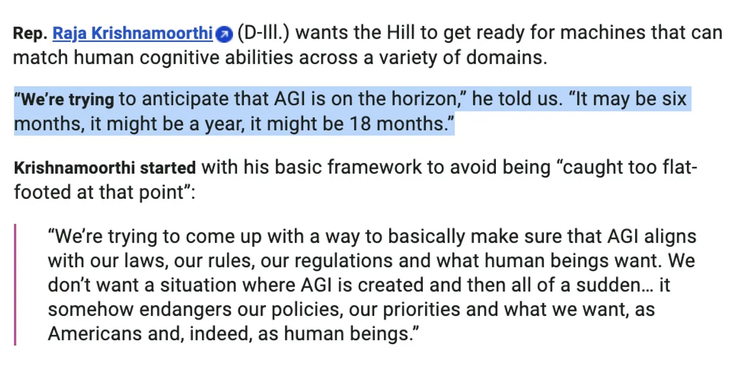 Le 29 juin, Punchbowl rapporte que le représentant Krishnamoorthi (D-IL) anticipe une IA générale dans 6 à 18 mois et souhaite préparer des politiques :